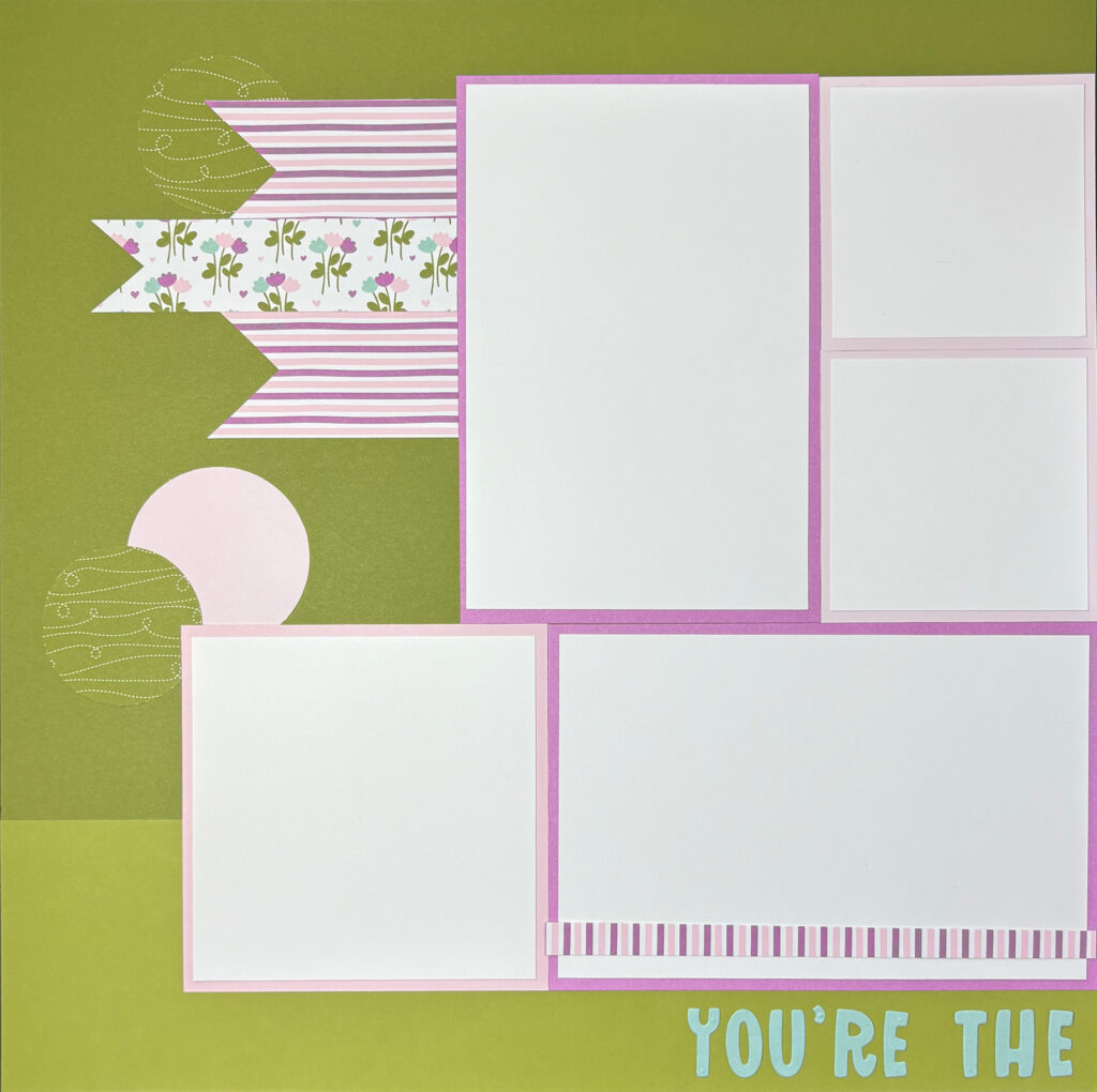 17. Take half of your title [for our layout, ‘You’re The’] and adhere at the bottom of the page as shown, either by removing the adhesive sheet or using your multipurpose glue.