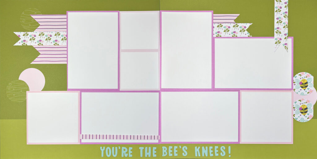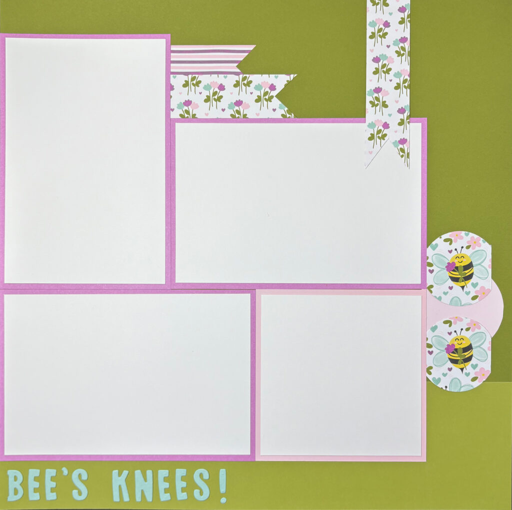 18. Take the remaining half of your title [for our layout, ‘Bee’s Knees!’] and adhere at the bottom of the page as shown, either by removing the adhesive sheet or using your multipurpose glue.