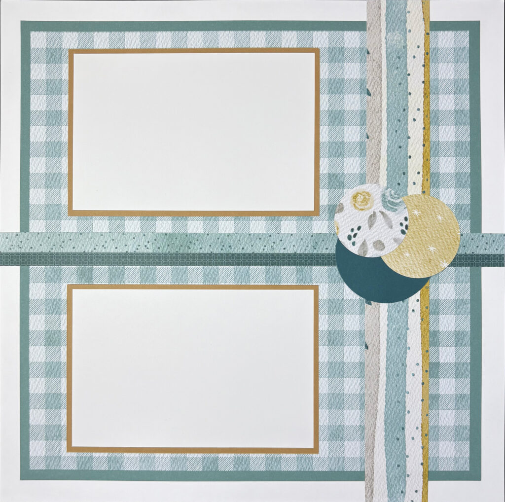 3. Take one (1) 6” x 12” Everyday You & Me, Lost Lagoon, and one (1) 5 ½” x 12” Everyday Happiness, Checkered. Adhere the Checkered in the center of the Lost Lagoon with your Stampin’ Seal. Adhere the stack horizontally at the top of your base, approximately ½” from the top as shown in the picture.