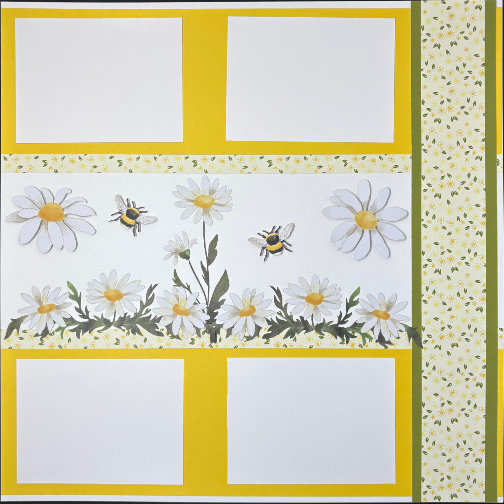 8. Take four (4) 4” x 3” Basic White. Adhere horizontally in Daffodil Delight at the top and bottom of the page with your Stampin’ Seal as shown in the image.