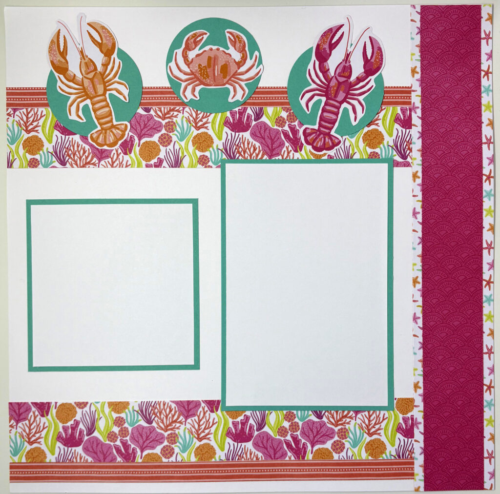 - Fussy cut out a lobster and two crabs. Adhere at the top of your base as shown in the image with your Stampin’ Seal or your Multipurpose Liquid Glue.