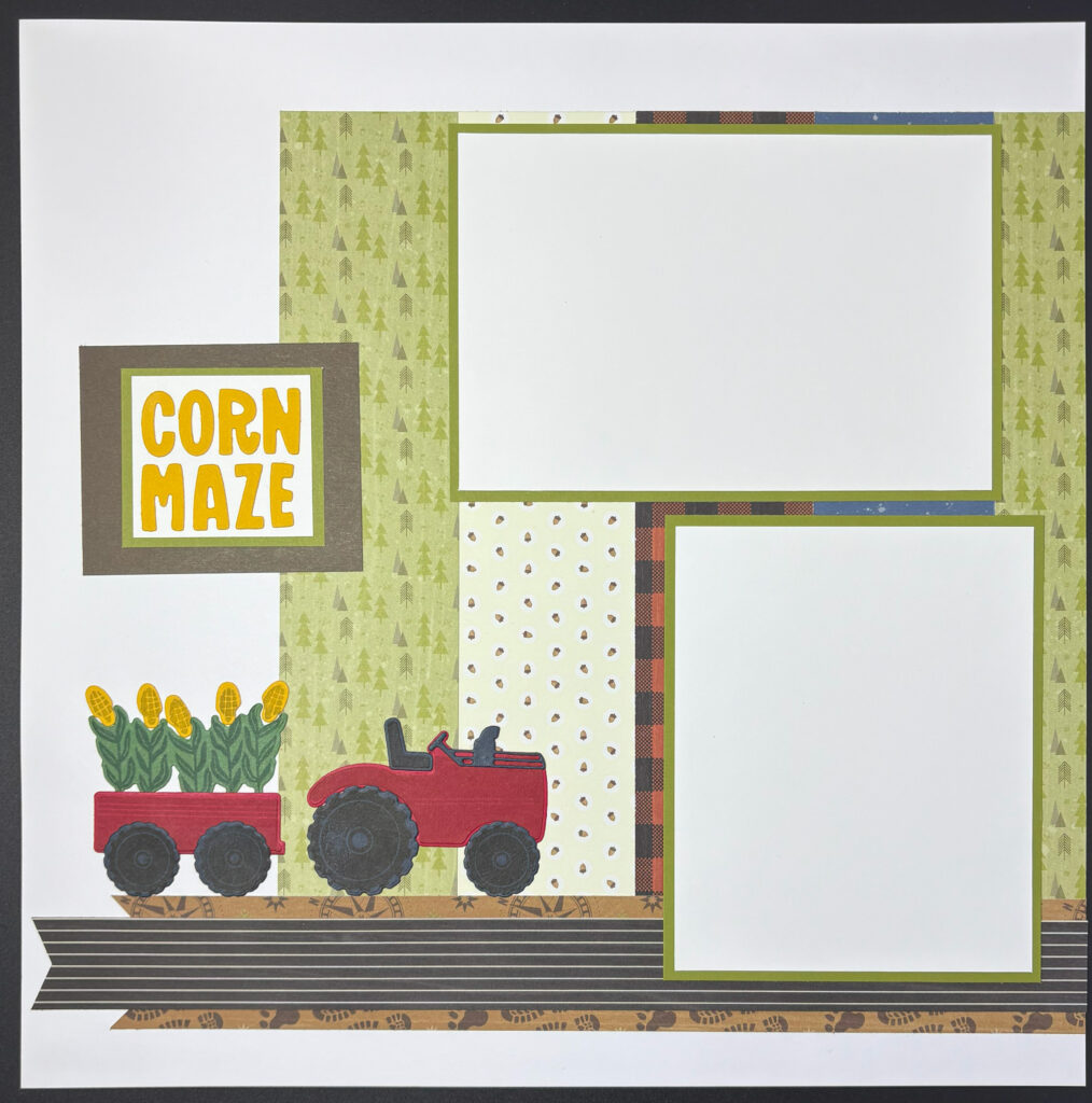 11. Take one (1) 4” x 6” Crushed Curry. Using the Mini Alphabet Dies and your Stampin’ Cut and Emboss Machine, cut out sentiments for your page. For this layout, we used ‘Cornrides’. Adhere to the 2” x 1 ¾” Basic White with your Multipurpose Liquid Glue [or add an adhesive sheet before cutting]. Adhere the Basic White to the center of one (1) 2 ¼” x 2” Mossy Meadow with your Stampin’ Seal. Adhere the stack in the center left of your base with your Stampin’ Seal as shown.