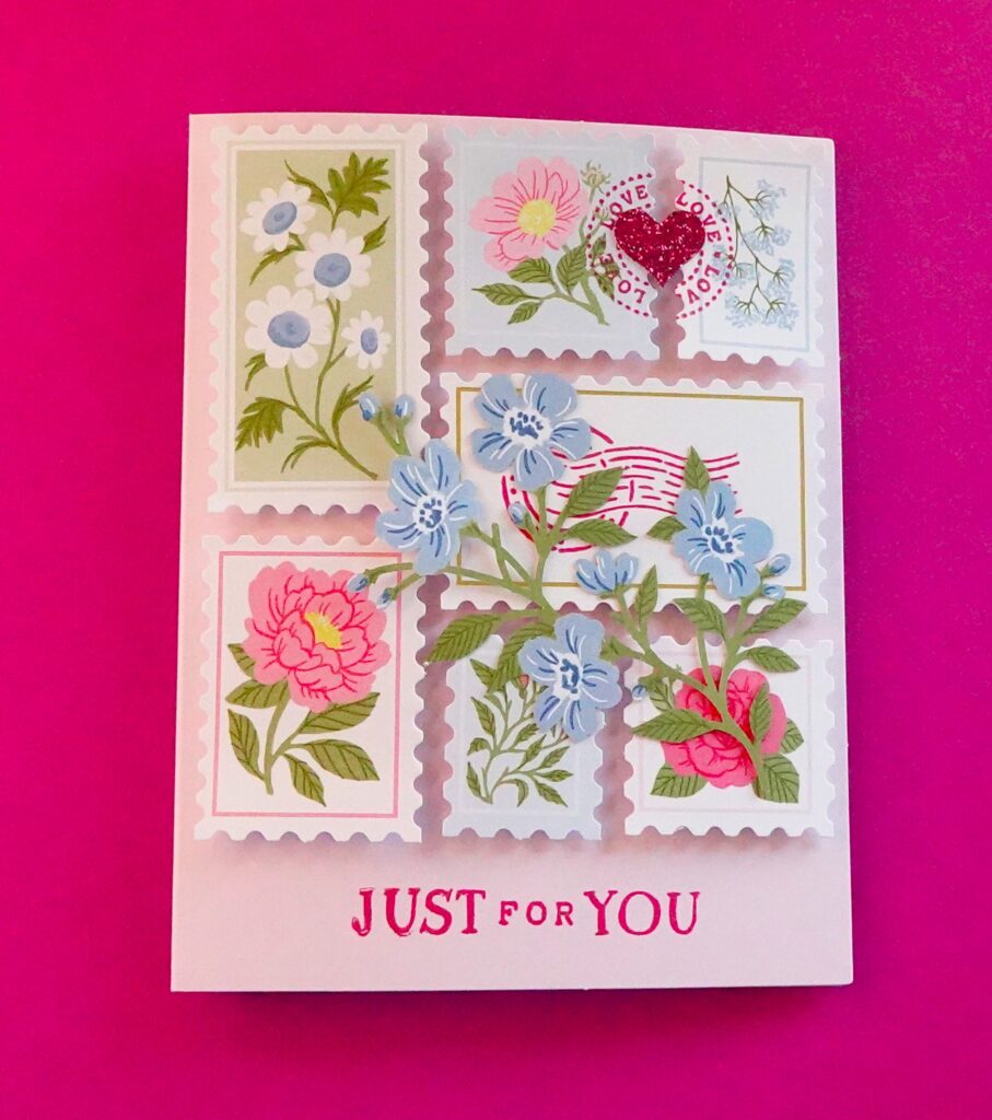 I love a collage of different postage stamps! When I was younger, I collected stamps from every country because they felt like little pieces of art—tiny snapshots of the world. This card is straight from the January 2026 Paper Pumpkin Kit: Special Delivery, and it comes together beautifully with the clear step-by-step directions provided. I added a little sparkle by punching a heart from leftover red glimmer paper—because as stampers, we never throw away the “good little bits” and it pays off in spades just like this!